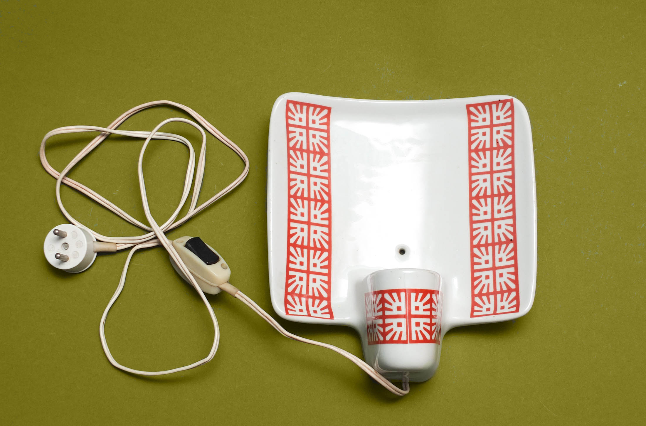 Öntöttvas radiátorra tehető párásító. Valószínűleg a Kőbányai Porcelángyár/KŐPORC készítette, jelzés nincs rajta.
